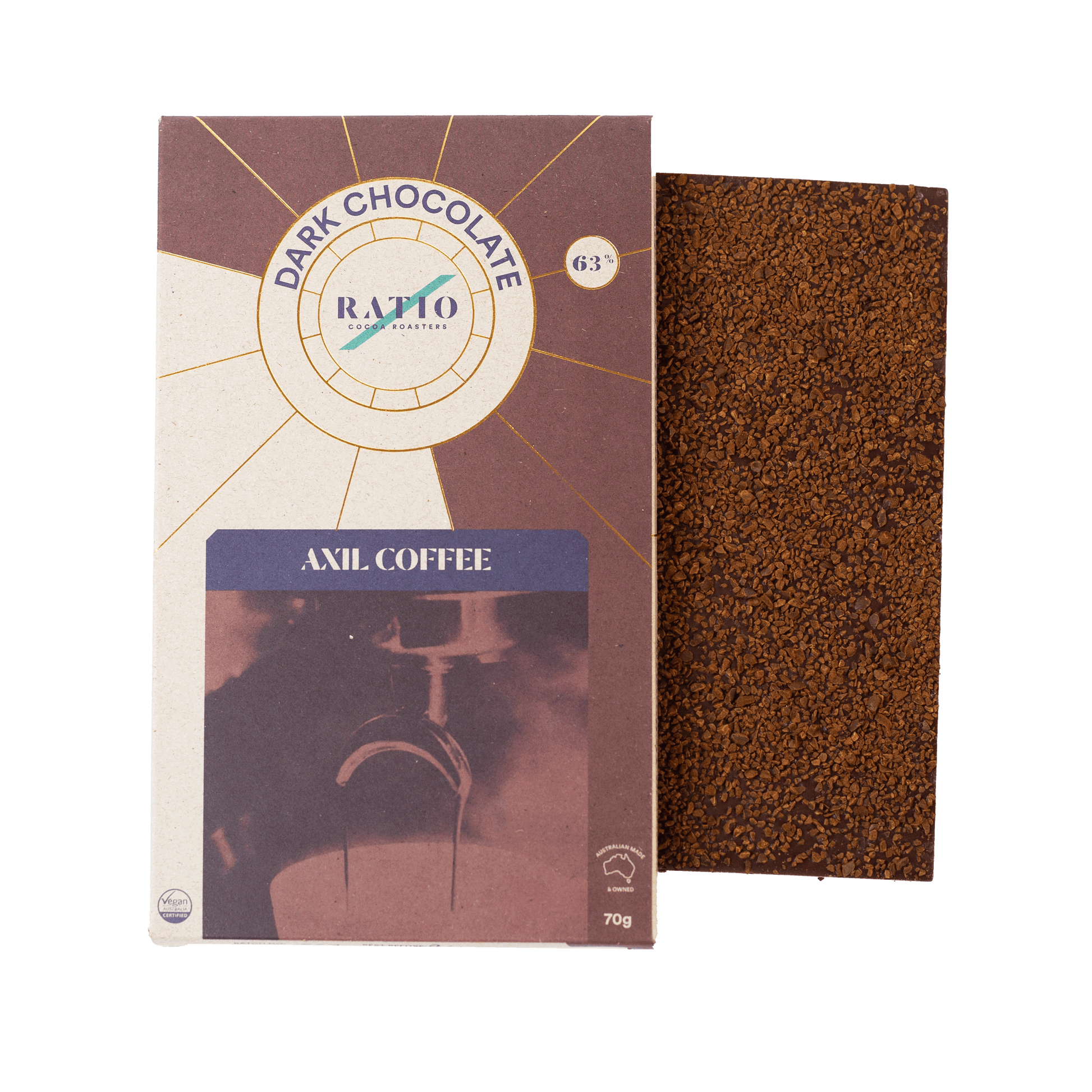 Ingredients: Cacao beans (63%), raw cane sugar, Axil coffee beans.